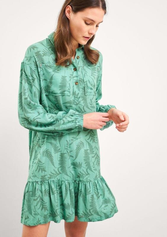 Фірмова , стильна сукня з довгими рукавами , м'ятного кольору з принтом , плечі спущені 53 , ПІГ 54 , ПІТ 57 , ПІБ 61 , рукав від горловини 71 , довжина виробу 95 .