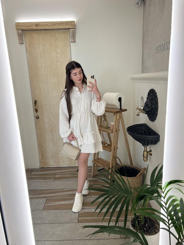 Дуже гарна сукня з мусліну. Приємна і дуже легка. На талії резинка тягнеться тому можна і на S і на М. Одягала декілька разів