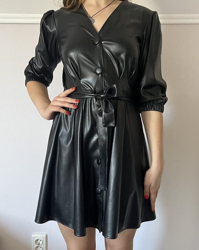 Розмір: 46 (не підійшов, тому продаю) Стан: абсолютно нова, лише приміряла Матеріал: еко-шкіра з еластичністю (м’яка, приємна, тягнеться) Колір: класичний чорний Сукня з поясом на талії, V-подібним вирізом і декоративними ґудзиками 📌 Купувала за 950 грн