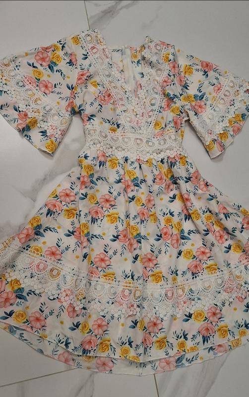 Лёгкое нежное платье в идеальном состоянии без нюансов. Застегивается на молнии сзади, карманы отсутствуют. Вокруг талии идет кружево, которое просвечивается, но не сильно, все в границах приличного (последнее фото). Глубокое соблазнительно декольте. Длина 87см Плечи 40см Полуобхват груди 46см Полуобхват там, где кружева 38см. От талии платье идет расклешенное. Возникнут вопросы - пишите.