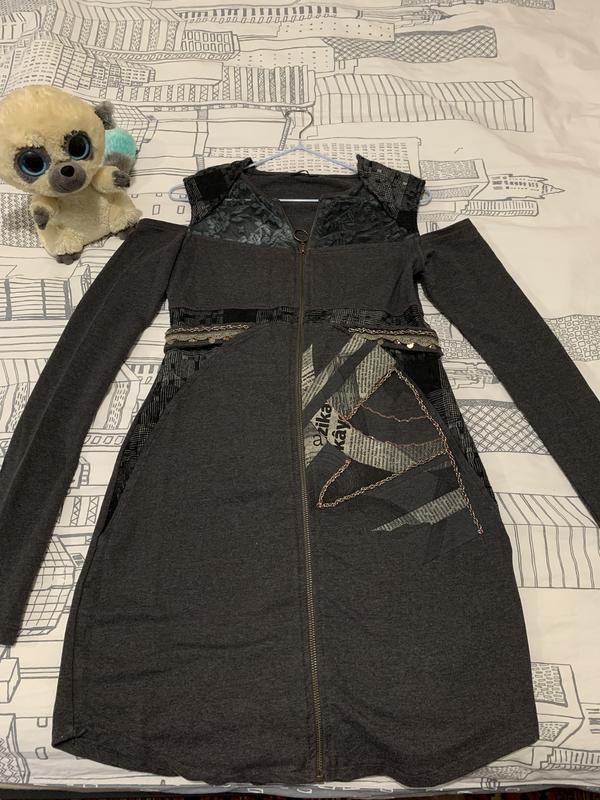 Стильняча дуже незвичайна приталена, по всій довжині блискавка , плечі оголені, обшита бісером, розмір с