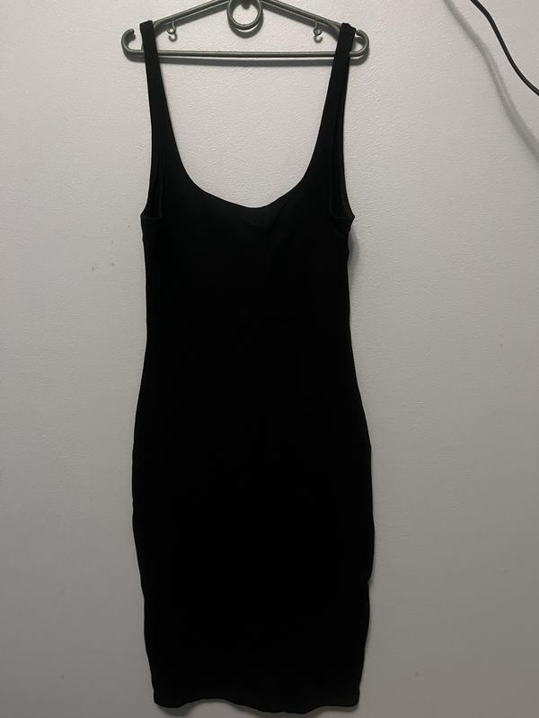Ідеально чорна сукня, яка гарно сідає по фігурі. Розмір вказаний s, підійде і на М. По спинці йде полоска, яка візуально додає стрункості. Довжина по спинці (десь з рівня лопаток) 71см
