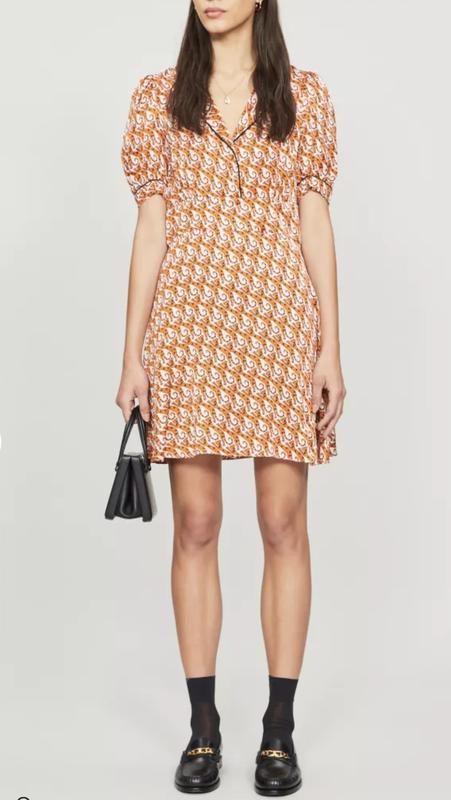 Коротка сукня з принтом і контрастною окантовкою на вирізі та манжетах Застібається спереду на дві ґудзики та приховану блискавку збоку пог-47 см пот-38 см довжина -88 см