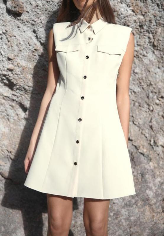 Расклешенное платье-безрукавка с подплечниками. Спереди имеет клапаны и декоративные золотистые пуговицы. Застегивается на пуговицы и для удобства сбоку есть молния. Платье новое, но нуждается в стирке. Является загрязнение тональным кремом. В цене учтены. Размер указанный XL, но подойдет и на L. Дополнительные фото и замеры по запросу.