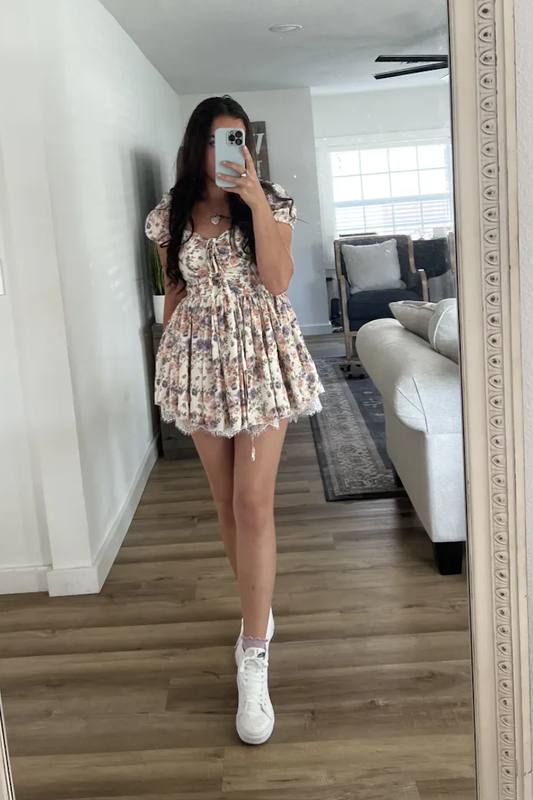 Очень красивое пышное платье, которое имеет вшитые шорты. Красивая, легкая и цветочная. Размер М. Замеры: длина 75 см по груди 46 см + можно чуточку рохронить спереди шнуровку и будет + 3-4 см по талии 40 см В объявлении реальные фото отклика с сайта.