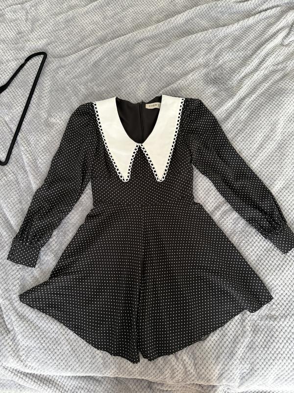 Чорна в білий горошок сукня міні, розмір xs, СHER 17. Не одягалась, тільки примірялась, висіла в шафі. Заміри: Довжина від талії - 44 см Напівобхват талії - 33 см Довжина рукава з манжетом- 60 см Від плеча до талії - 38 см