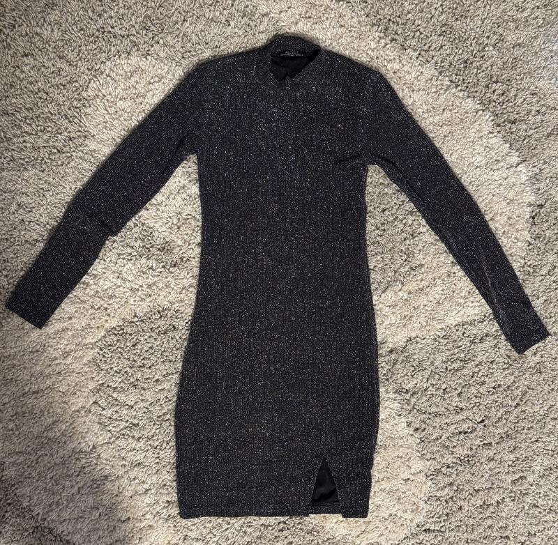 Идеальна для романтического вечера или похода на вечеринку Облегающее, темно серое, ближе к черному, короткое платье с маленьким разрезом по ножке Размер М, но лучше всего подойдет на параметры S Прошита люрексом для большей праздничности
