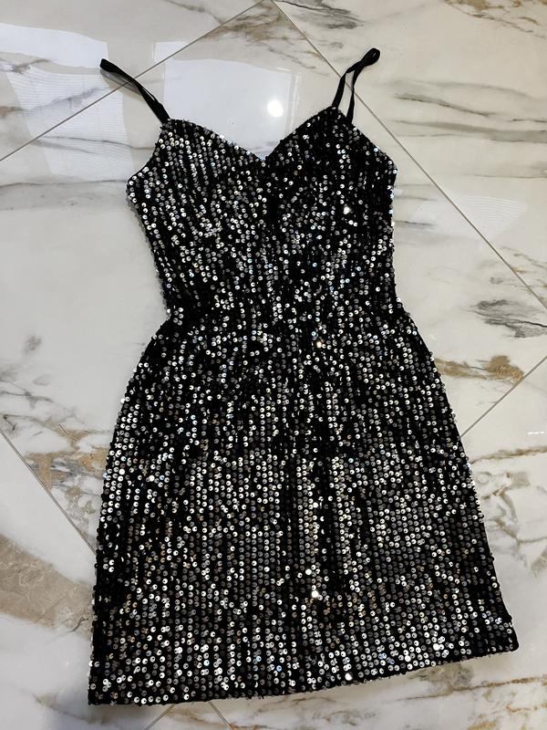 Чудова сукня , чорного кольору , обшита повністю в паєтки, неймовірно гарно виглядає та блистить при світлі софітів. Зручна , гарно сідає по фігурці. Має підкладку