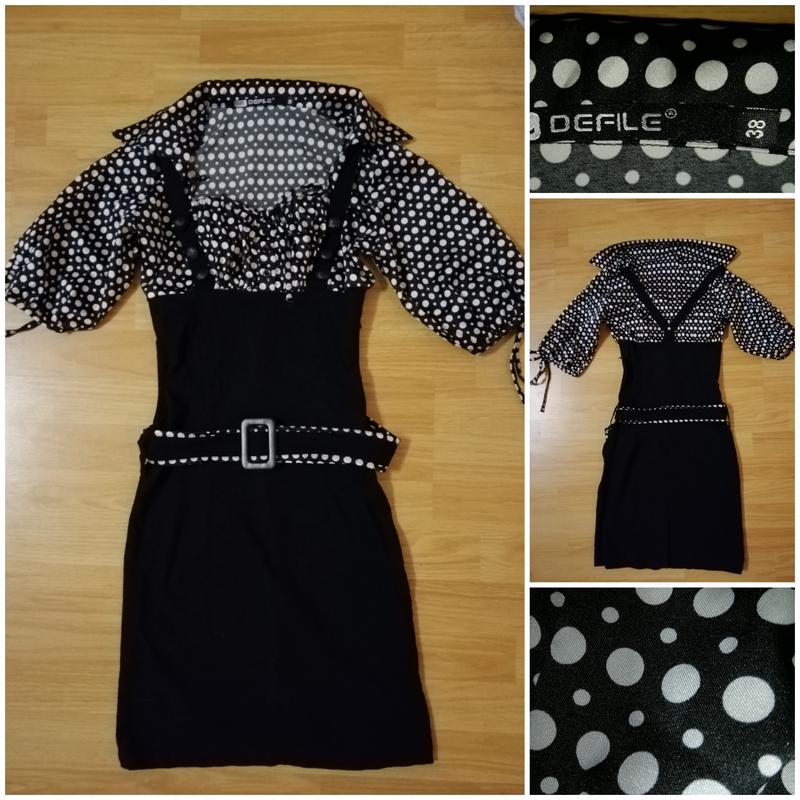 Платтячко в горох. Низ стркйчовий, добре тягнеться. Верх (в горох) атласний. Рукави по низу на зав'язках, можна робити рукав "фонарік" або прямий. Ззаду є невеликий розріз. На розмір XS-S Без дефектів.