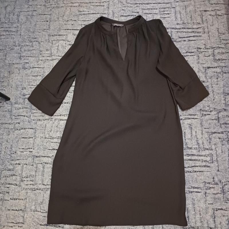 платье свободного ( прямого) кроя. длина до середины колена рукав 3/4 воротник стойка есть вырез декольте можно как свободную носить так и с поясом размер 14-16