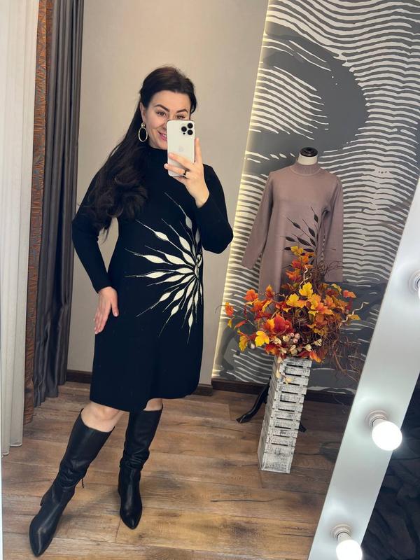 комфортна і помітна трикотажна сукня вільного крою — м'яка, зручна і дуже приємна в носінні, не тягне, не тисне, красиво сидить і підходить на кожен день , комір-стійка акуратно виглядає і зберігає тепло, сукня прикрашена красивим квітковим малюнком зі стразами і задає настрій, притягує погляд і візуально робить сілует стрункішим , довгі рукави додають затишку і роблять сукню універсальною — і для роботи, і для прогулянок, і для зустрічей розмір єдиний 46-48 довжина 94 см, об'єм грудей по виробу 104 см добре сідає на параметри 96-112 см, стегна 116-118 см, довжина рукава від шиї 66 см
