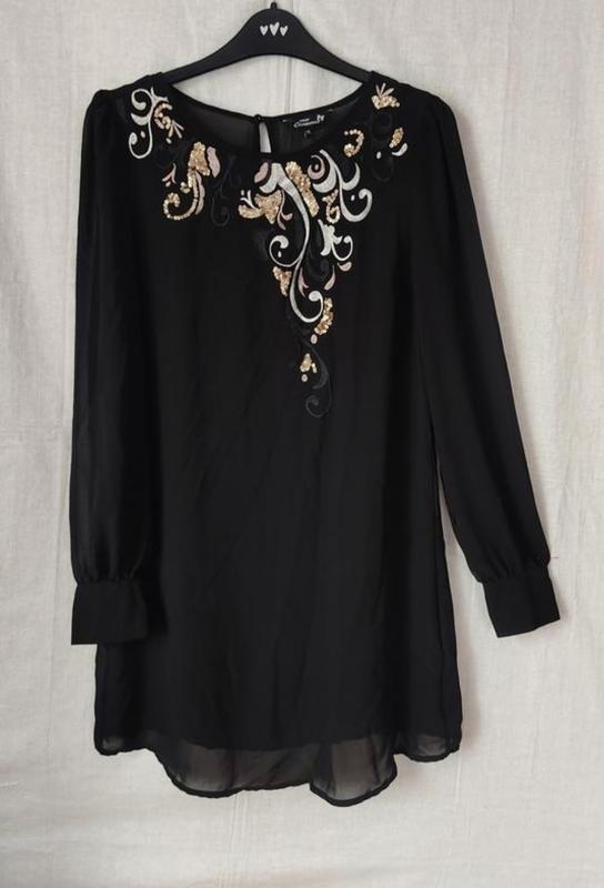 Сукня чорного кольору: довгий рукав на манжеті з ґудзиком, обтягнутим тканиною; верх переда прикрашений шикарною вишивкою шовковими нитками та паєтками; низ переду трохи подовжений; тканина як м'який напівпрозорий шовк; необхідний чохол; із колекції Occasionwear молодіжного американського бренду Papaya. Виміри: довжина від 81 спереду до 78 ззаду; плечі-36; рукав-64; пог-45. 5; піт-45; поб-47; обхват низу -106. Розмір uk-10 (44). Можна носити, як туніку. Підібрала чехол, розмір 44,тоненький атласний, але треба буде вкоротити.(фото 9)