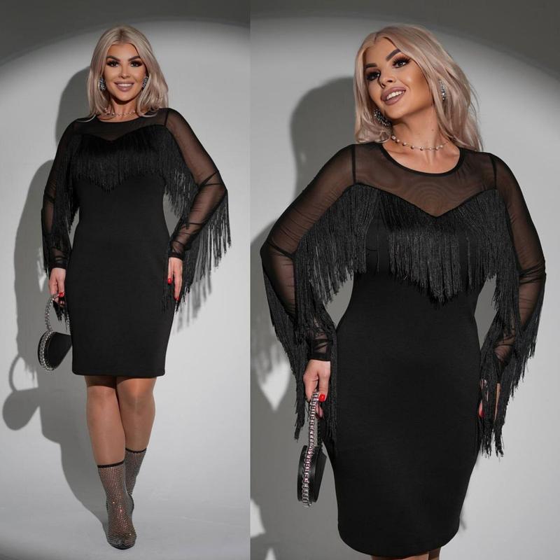 1112254 ✅Размер: 48-50, 52-54, 56-58, 60-62 ⭐️Ткань: крепдайвинг+ бахрома ✅Цвет: черный Стильное платье, выполненное из комфортной, эластичной ткани, мягко облегает, не сковывает движения. Сетка на рукавах и декольте, мягкая и приятная к телу, не колется. Бахрома красиво двигается при каждом шаге, создавая динамику и праздничное настроение. 📎Замеры👇: Внимание! Растяжимость ткани 10 см. Модель носится по фигуре, учитывайте это при выборе размера. ✨48-50 Обхват грудей: 92 см Обхват стегон: 94 см Длина изделия: 93 см Длина рукава: 57 см ✨52-54 Обхват груди: 104 см Обхват стегон: 110 см Длина изделия: 96 см Длина рукава: 58 см ✨56-58 Обхват грудей: 112 см Обхват стегон: 116 см Длина изделия: 96 см Длина рукава: 58 см ✨60-62 Обхват груди: 120 см Обхват стегон: 128 см Длина изделия: 99 см Длина рукава: 58 см