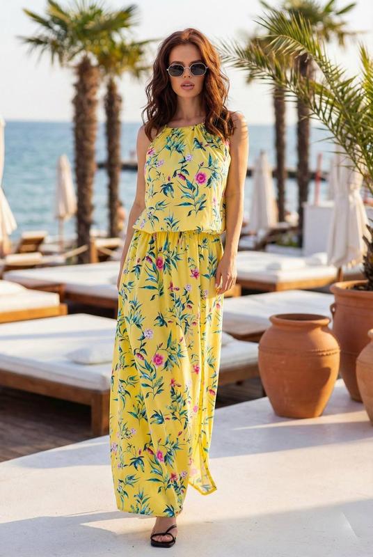 Сукня №510/0258 Жовтий 42-46,48-52 Рожевий 42-46,48-52 Тканина бавовна Кольори жовтий, ментол, пудра Довга сукня на підлозі, на поясі гумка