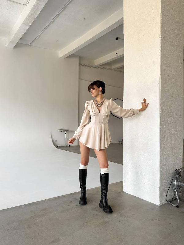 Сукня - комбінезон арт. rkot. 831 Розміри: S, M, L, XL Тканина: костюмна високої якості Імітація корсету попереду, застібається на блискавку Кольори: чорний, беж, шоколад, молочний Відмінна якість