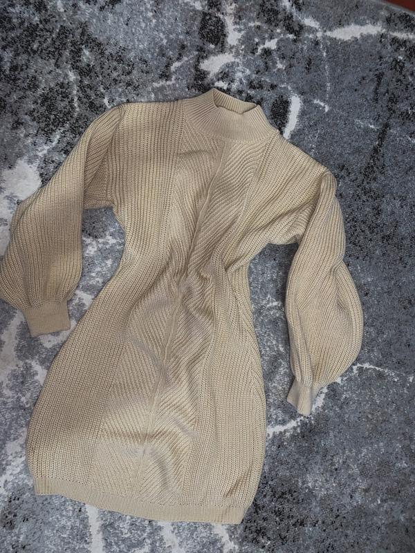 Тепла в'язана сукня бежевого кольору в новому стані. Особливості: • Матеріал: в'язане полотно • Розмір: S/M • Колір: бежевий • Стан: новий • Приталений крій підкреслює фігуру • Довгі рукави з манжетами • Висока горловина • Фактурне в'язання з рельєфним малюнком Ідеально підходить для прохолодної погоди. Універсальна модель для повсякденного носіння та особливих випадків.