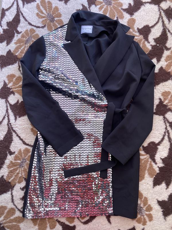 Состояние супер. Платье пиджак - можно носить как платье , можно под джинсы как верхний слой. Оторвалось пару серебристых треугольников не заметно. Длина 85 Рукав 61 П/о грудь 48 П/о талия 41 П/о бедра 45 Но можно регулировать так как он на завязках