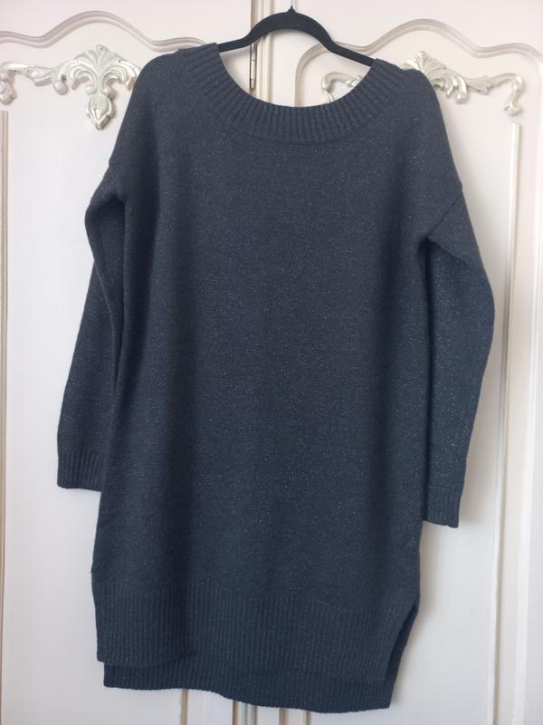 Стильна сукня оверсайз, з люрексом, на спині гарний виріз, по боках розпорки, розмір М, Пог 57см, плечі 60см, рукав від шиї 70см, довжина .склад 86см, спереді 80см, склад: 53% акрил, 18% поліестер, 16% вовна, 5% люрекс, 5% альпака, колір темний графіт, нове без паперової бірки.