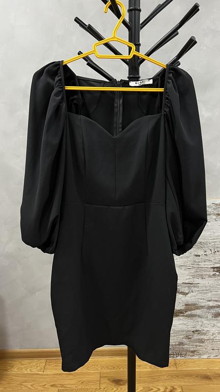 Сукня-футляр, довжина міні з обʼємними рукавами та гарним декольте. Довжина до колін на зріст 162 см. Бедра до 103 см. Розмір М-Л.