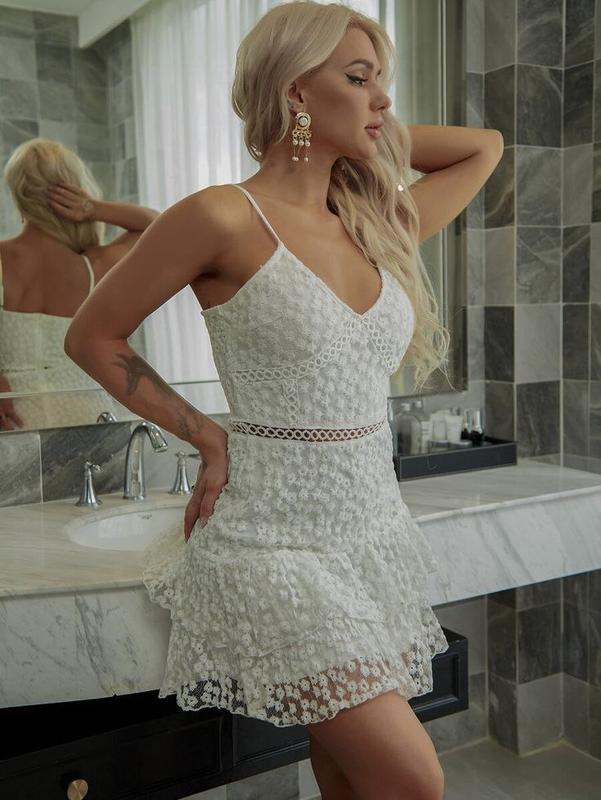 Біла мереживна сукня на бретелях з V-подібним вирізом і багатошаровою спідницею. На талії мереживо вибито до прозорості,що дуже гарно додає акценту талії Розмір м