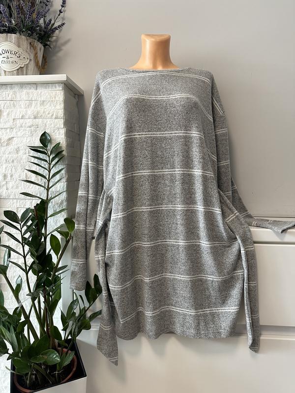 Повсякденна сукня-джемпер або видовжений пуловер (туніка).Горизонтальні білі смужки на сірому фоні, виріз «човник» або неглибокий круглий виріз.Модель має пояс-зав'язку для акценту на талії .,тканина з м'якого трикотажу (суміш віскози, поліестеру і акрилу). Р.14,довжина 95,Пог 54