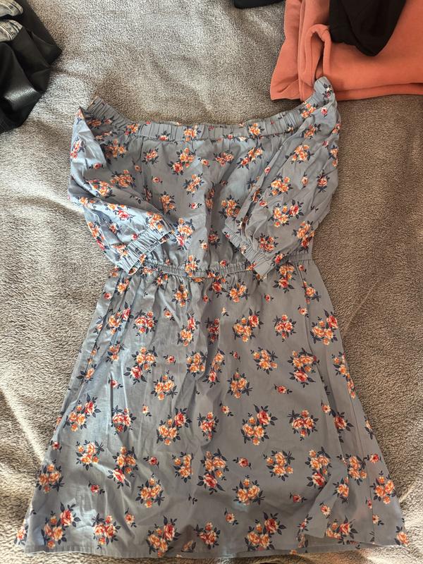 Це легка літня сукня блакитного кольору з дрібним квітковим принтом у рожевих та помаранчевих відтінках. Модель має відкриті плечі (фасон «анжеліка») на еластичній гумці та рукави довжиною три чверті з тонкими манжетами. Талія підкреслена вшитою резинкою, що створює жіночний силует, а спідниця має вільний крій довжиною вище коліна.