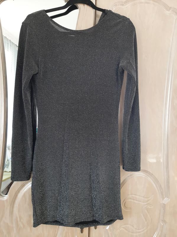 Короткое платье черного цвета с люрексовой нитью. Полуобъем груди- -41 см Полуобъем талии -34 см Полуобъем бедер -45 см. Длина-81 см. Хорошо тянется.Без дефектов.