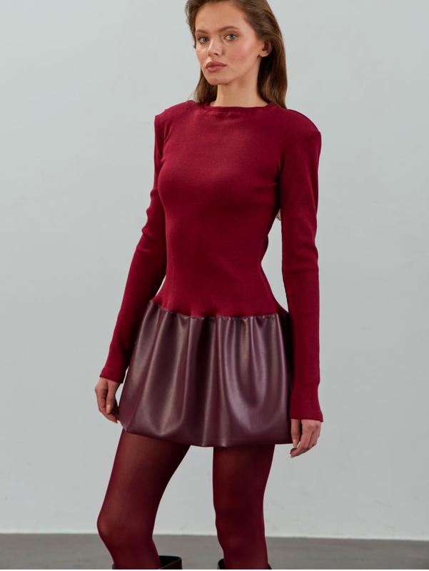 Опис Сукня "Грета" бордо Сучасна інтерпретація класики: сукня поєднує трикотажний верх і спідницю з екошкіри, що додає образу акценту. Ідеальний баланс між стриманістю та стилем - на кожен день або вечірній вихід. Кольори: бордо. Догляд: ручне прання при температурі 30 градусів. Сушити горизонтально. Прасувати спідницю з екошкіри через бавовняну тканину при мінімальній температурі або обробити паром з відстані.