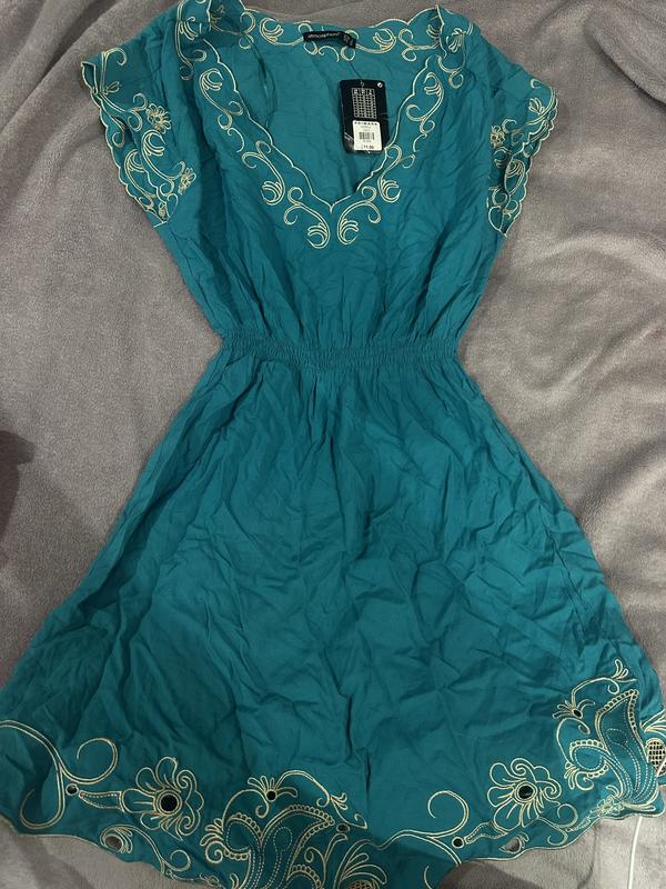 Опис сукні: Легка літня сукня насиченого бірюзового кольору з ніжною світлою вишивкою. Модель має V-подібний виріз, який красиво підкреслює декольте, та короткі вільні рукави з декоративною вишивкою. Верх і низ сукні прикрашені витонченими квітковими орнаментами, що додають їй жіночності та елегантності. На талії є еластична резинка, завдяки якій сукня добре сідає по фігурі та підкреслює силует. Спідниця злегка розкльошена, легка і повітряна, що робить сукню комфортною для теплої погоди. Ідеально підходить для літніх прогулянок, відпочинку, моря або повсякденного образу. Новa, з біркою.