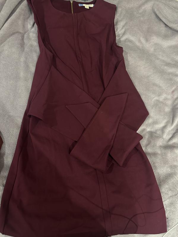 Елегантна бордова сукня Стильна бордова сукня без рукавів з витонченим жіночним кроєм. Модель підкреслює фігуру завдяки приталеному силуету та декоративним складкам на талії. Має круглий виріз та застібку-блискавку на спині. Сукня виглядає дуже елегантно та підійде як для офіційних подій, так і для свят чи вечірніх виходів. Особливості: • насичений бордовий колір • без рукавів • приталений фасон • декоративні складки на талії • блискавка на спині Чудово поєднується з підборами, класичним жакетом або мінімалістичними аксесуарами.