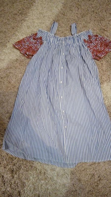 Чудове плаття для літніх прогулянок.на плечах досить туга резинка,такаж має лямки які регулюється.пуговки по довжині плаття є муляжні,воно не розстібається.на рукаві чудова вишивка.