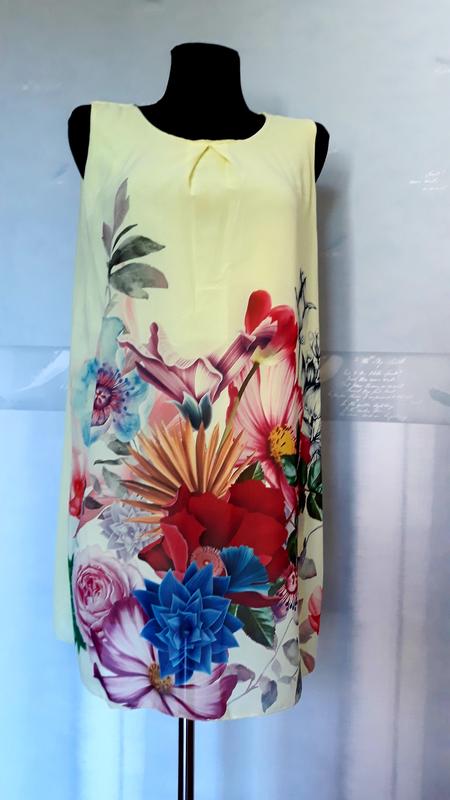 Платтячко з крепшифона.На підкладці .З яскравим принтом.Ніжно лимонно-жовтого кольору. Вільний від грудей. Пог 52 Побіди вільно.Довжина від плеча 87.