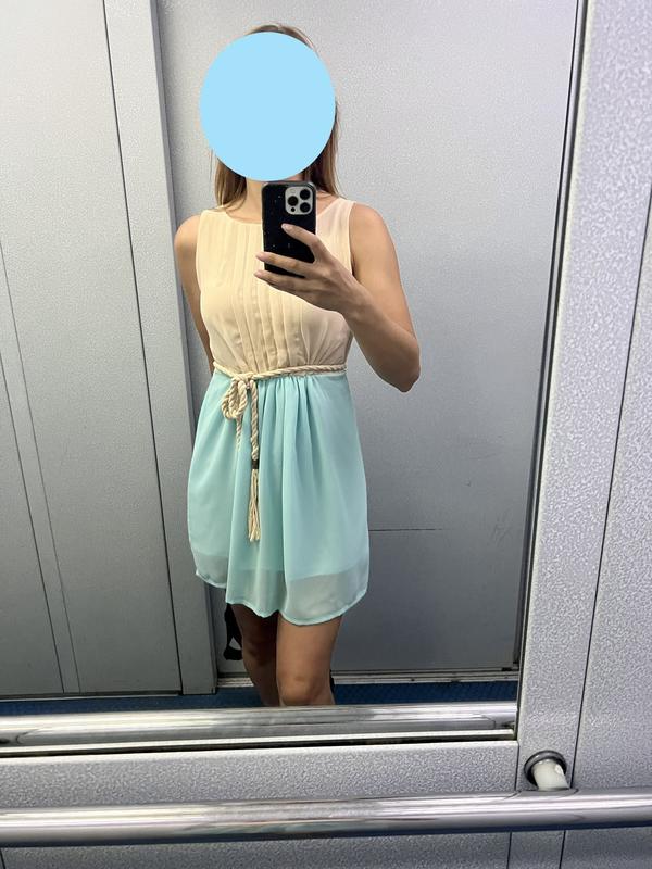 Літнє плаття. Колір кремово-бірюзовий. Тканина поліестер. На поясі не щільна гумка. Також є пояс мотузочком, який можна зняти. Розмір s. У дуже гарному стані.