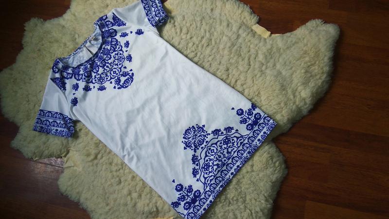 Красивое и стильное платье Цвет очень яркий белый + синие узоры. Коротенькое. к низу ровное. Очень хорошо сидит и смотрится Размер м Очень красивое. Не светится