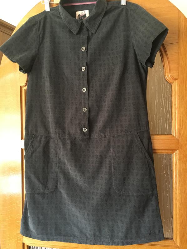 Дуже красиве плаття,дрібний вельвет з малюнком;колір-мокрий асфальт приблизно вийшло фото -6,7.перід-гудзики,є дві кишені,плаття пряме-заміри-довжина-88см,груди-52см,бедра-52см,низ-56см.ніяких дефектів та затертостей!