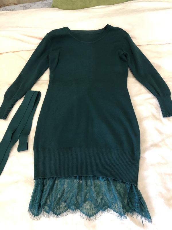 Тепленьке сукня міні. Купувала в Olko. Глибокого зеленого кольору, з мереживною оборкою. Дуже добре тягнеться. Дрібна в'язка.Підійде на будь-які параметри, вільно в талії в обтяжку на грудях і стегнах. Можна носити під пояс або без ( пояс в комплекті ) Мої параметри 87-65-91, сидить ідеально. Заміри на фото👆🏻