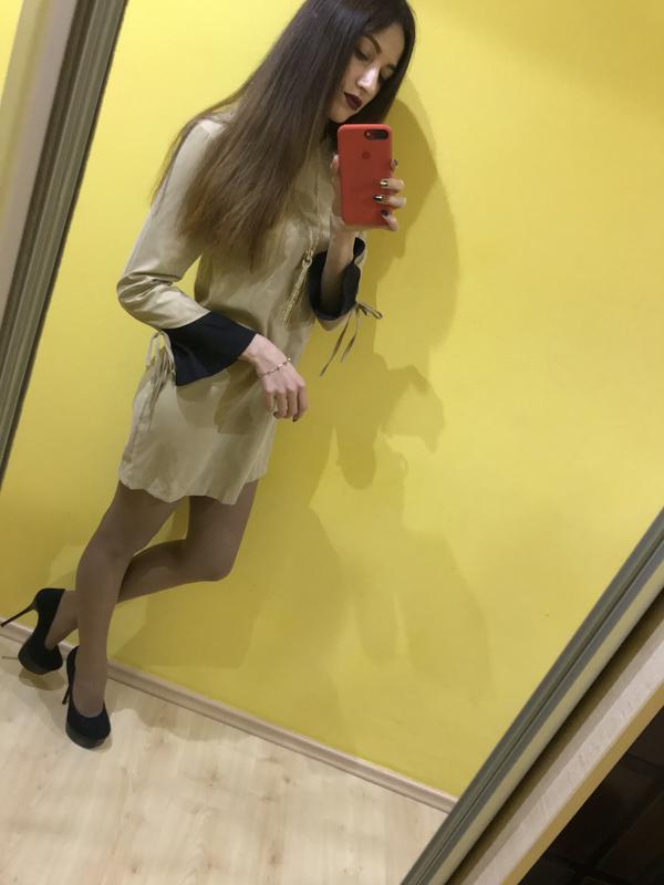 Плаття, бежевого кольору, з кльошним рукавом, довжина міні, тканина плотна(не просвічується), бархатна на дотик. Нове( подарувала сестра) так як у мене довгі руки, то рукав закороткий. І ще й після вагітності груди не поміщаються в плаття☹️ Дуже круте, шкода пролежувати в шафі. Розмір s