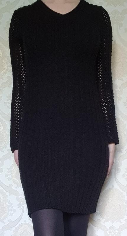 Трикотажне плаття з ажурними рукавами, приталене, гарно підкреслює фігуру, дуже тепле. У спокійному стані ог 34см, від 30см, про 32см. Добре тягнеться. Рукав 61см. Довжина 95см Одягнене на параметри 90-64-91