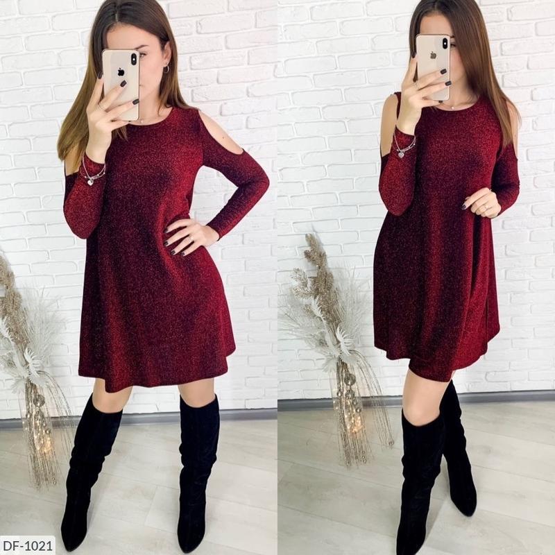 Сукня з голими плечиками, в дуже красивому кольорі, гарно переливається, в реалі ну дуже сяюче. Люрекс на трикотажі, тканина дуууже приємна до тіла, але воно не сильно плотне. Можна одягати також і під пояс, тоді дуже красива талія робиться. За рахунок свого фасону, підійде як на s так і на m