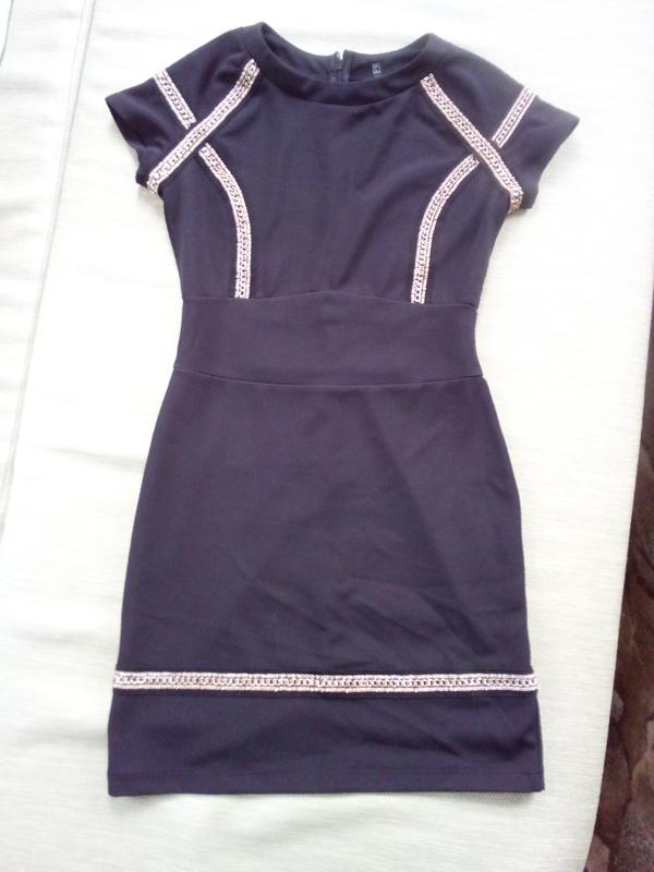 Оригінальне плаття з обробкою з металевої золотистої ланцюжка. Довжина - 85см. Піт - 35 див. ПоГ - 44см. Добре тягнеться. Колір насичений чорний (фото не передає).