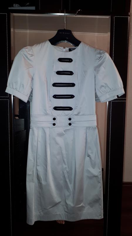 очень стильное строгое платье, известного дорогого бренда Таго , отличное качество и пошив, цвет светло бежевый, длина чуть выше колена.