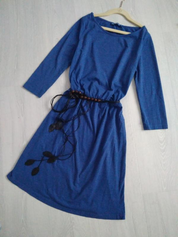 Синее котоновое платье. Рукав 3/4. пояс с бусинами и лепесточками продается отдельно-50 грн. Размер s. В поясе вшитая резинка. Замеры по запросу. Приятных Вам покупок)