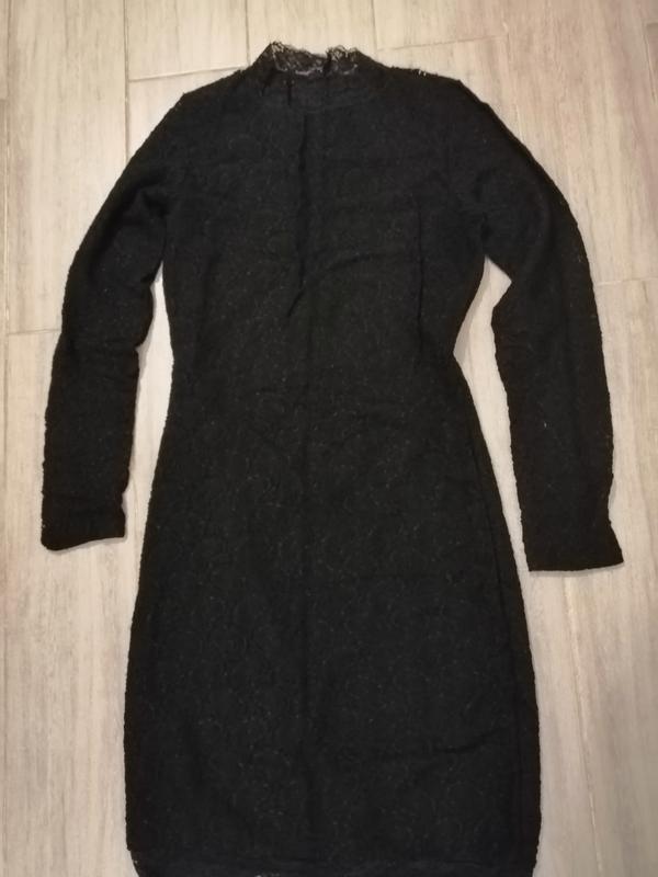 Мереживне плаття на підкладка, спина з вирізом, комір стійка, довгий рукав. Довжина 90, плечі 34, талія 34