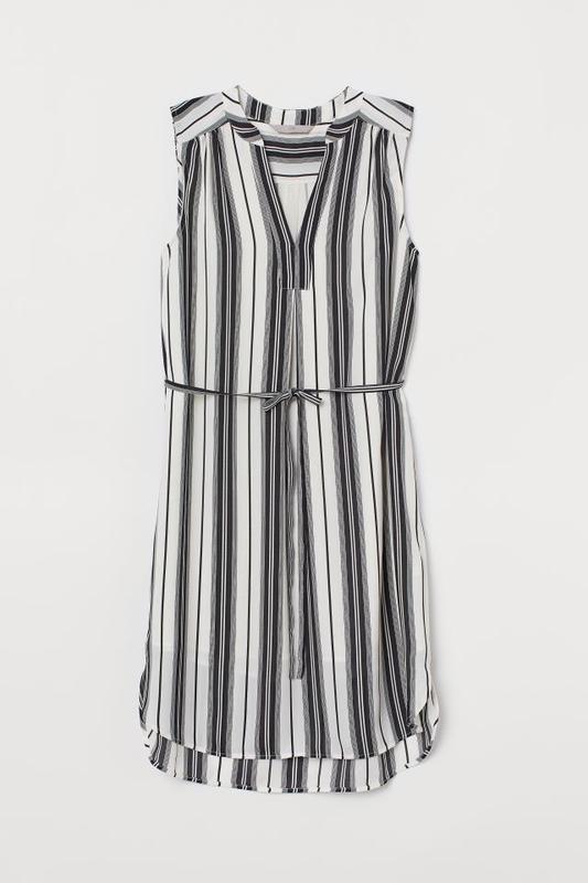Плаття без рукавів з креповой тканини з трикутним вирізом і невеликим комірцем-стійкою. Складання на плечах, відрізне по завязкам на талії. На підкладці. Опис:синя/біла смужка Розмір:34 СоставПолиэстер 100%Підкладка: Поліестер 100%