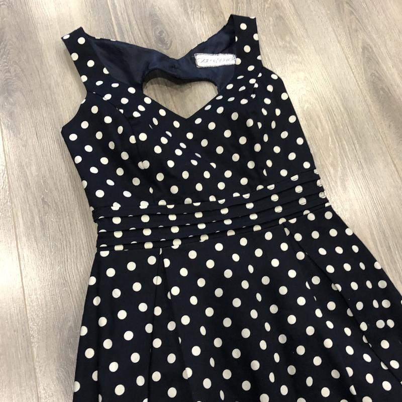 Актуальное, плотное платье в горох на подкладке , очень хорошо держит форму, красиво открыта спинка в форме сердца