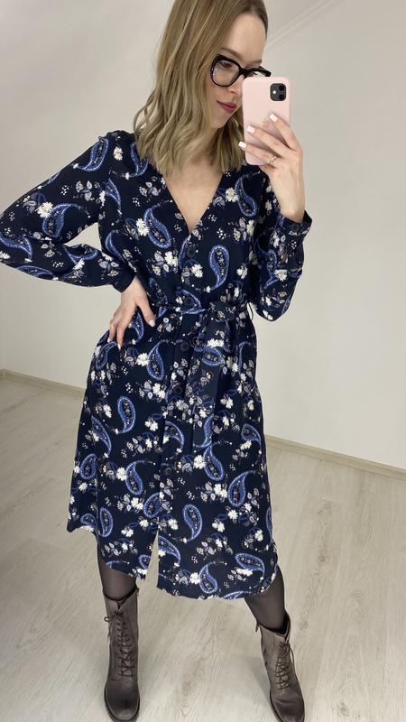 Цікаво сукня темно-синього кольору з дуже жіночним v-подібним вирізом, є поясок, який можна гарно підкреслити талію😇