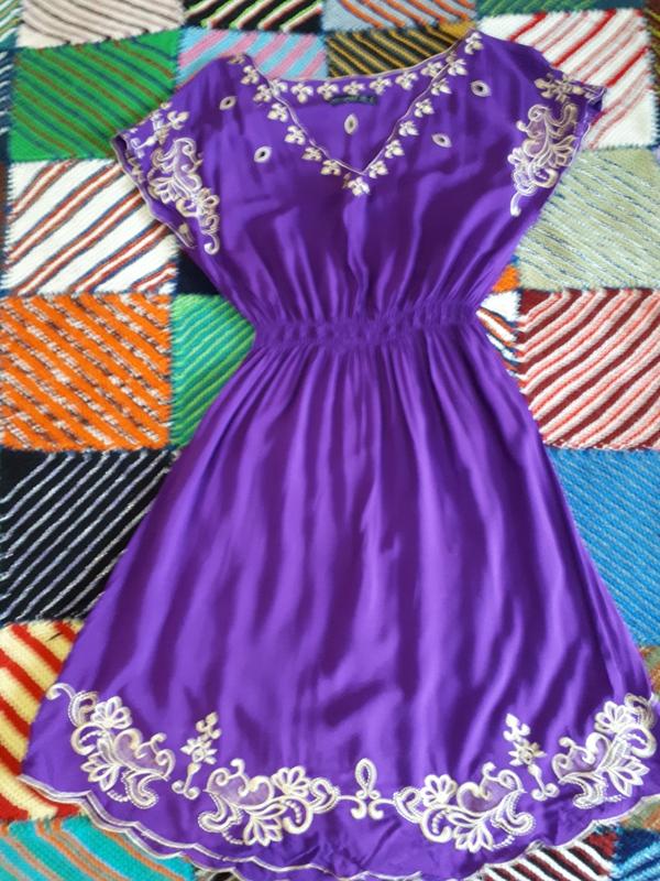 Прикольное платье,очень красивый цвет,первое фото передает цвет,красивая вышивка,длинна 90,талия на резинке