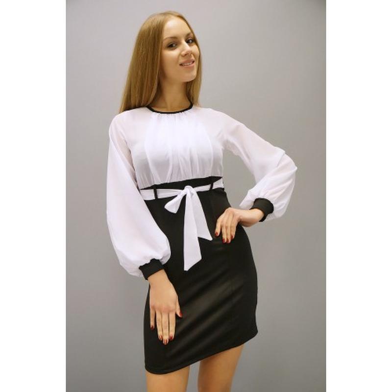 Сукня "Кіто" Колір: чорний+білий Матеріал: французький трикотаж+шифон Довжина: 89 см Ошатне плаття, вигідно підкреслює фігуру. Завищена талія візуально подовжує ноги, а верх із шифону з драпіруванням візуально збільшує груди. Прикрашене вшитим пояском-зав'язкою.