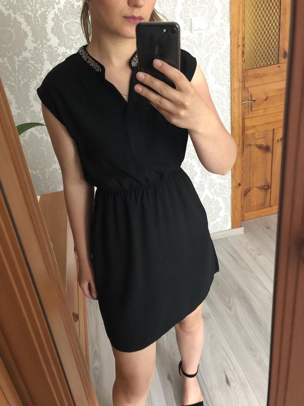Класичне чорне плаття з красивим воротніком, обшитим сірим бісером. На поясу резиночка. Стан ідеальний. Розмір с-м