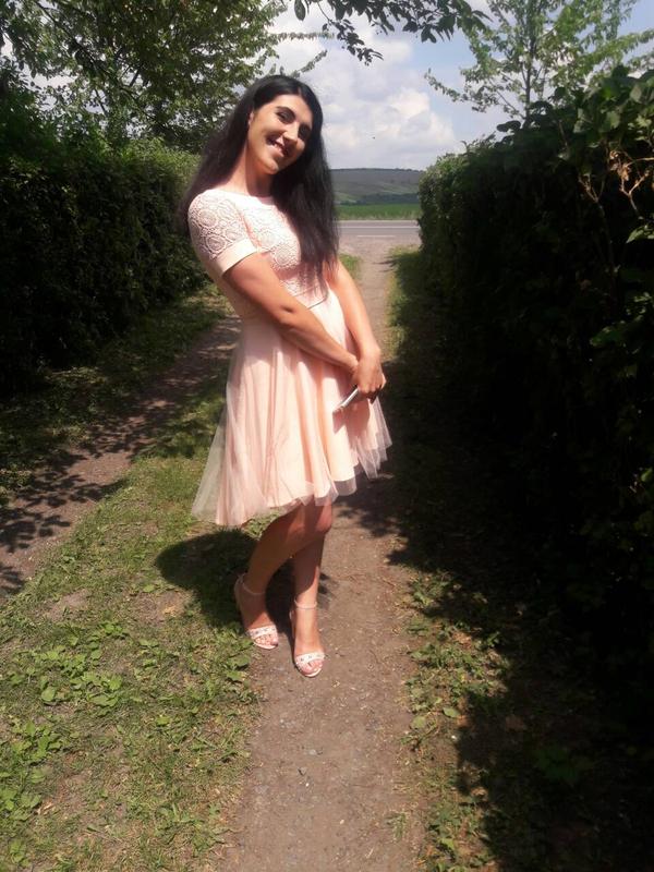 Персикове плаття. Раз було одягнене. Дефект видно на фото. Трішки розійшлося мереживо на рукавчику. Причина продаж, стало замаленьке(((